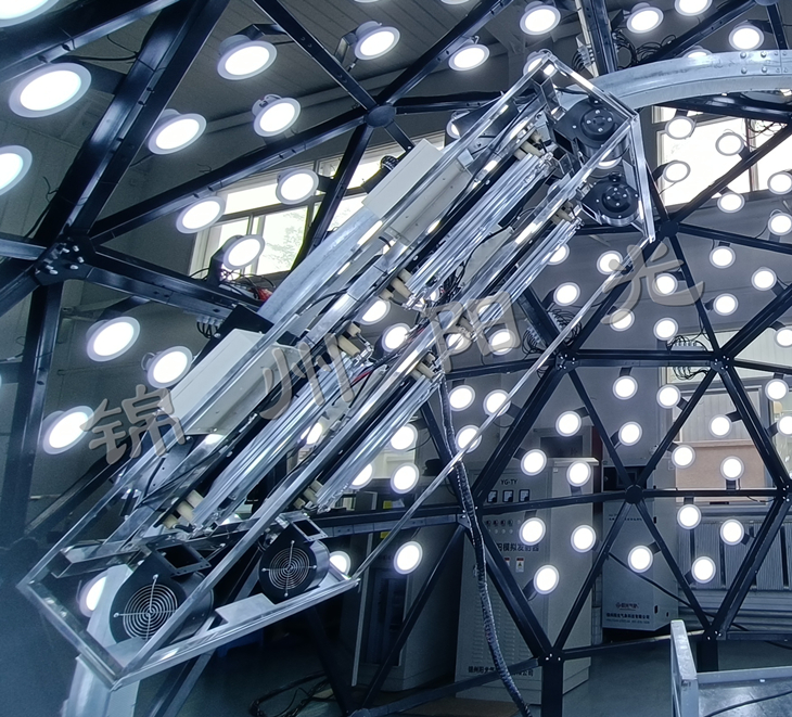 近年來隨著太陽能應用的不斷發展,關于太陽能利用、轉換的相關產品,尤其是太陽能電池板的使用量也逐漸增加。過去,這些產品都是在自然環境下進行測試,受制于氣候條件,因此存在測試周期長、數據的可重現性差等不足。JZYG-TGS1智能人工模擬天穹是模擬天空及太陽運行的一種光源設備,可以在高精度擬合太陽光譜分布的前提下,實現不同的太陽輻照度、光照角度等條件,滿足測試研究對太陽輻照的特殊需求。使用智能人工模擬天穹能夠克服氣候多變性所造成的不便,可以全年24小時在室內對太陽能產品進行測試。