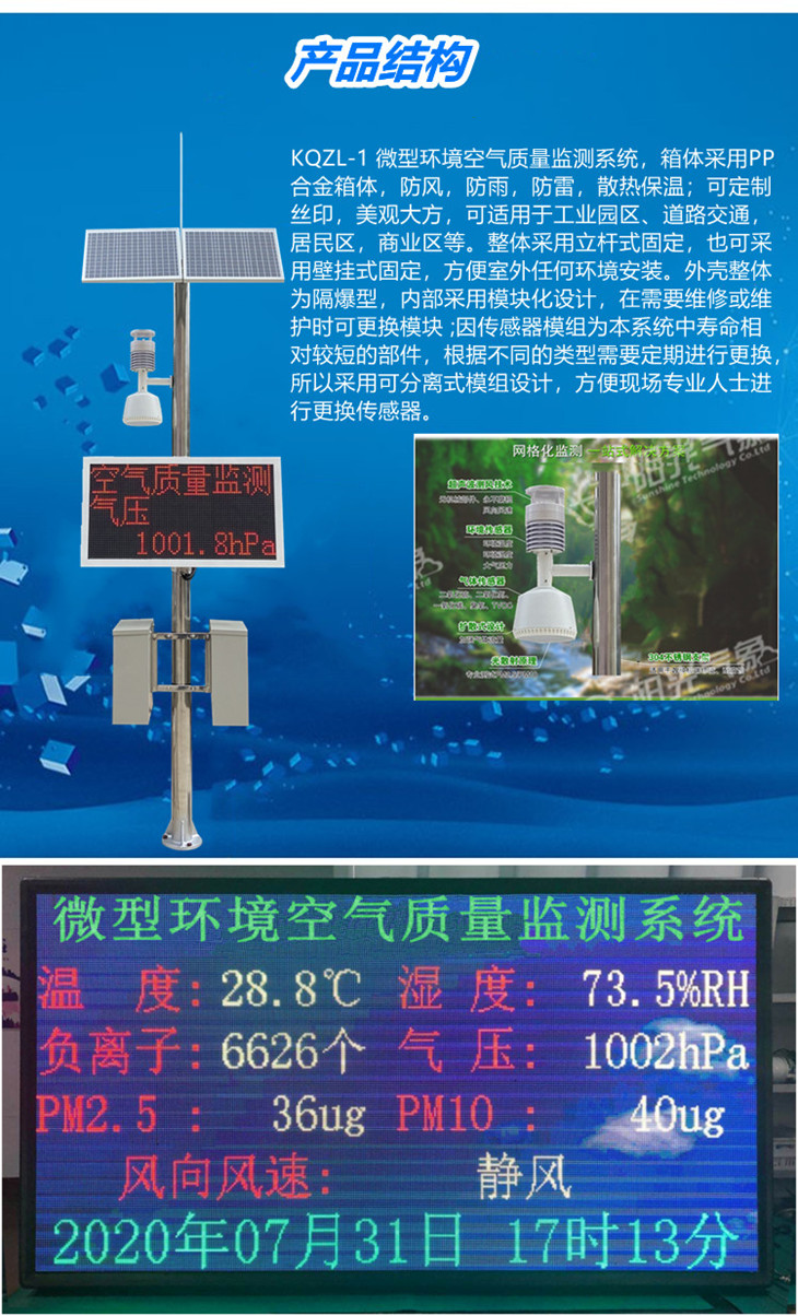 KQZL-1 微型環境空氣質量監測系統,箱體采用PP合金箱體,防風,防雨,防雷,散熱保溫;可定制絲印,美觀大方,可適用于工業園區、道路交通,居民區,商業區等。整體采用立桿式固定,也可采用壁掛式固定,方便室外任何環境安裝。外殼整體為隔爆型,內部采用模塊化設計,在需要維修或維護時可更換模塊 ;因傳感器模組為本系統中壽命相對較短的部件,根據不同的類型需要定期進行更換,所以采用可分離式模組設計,方便現場專業人士進行更換傳感器。