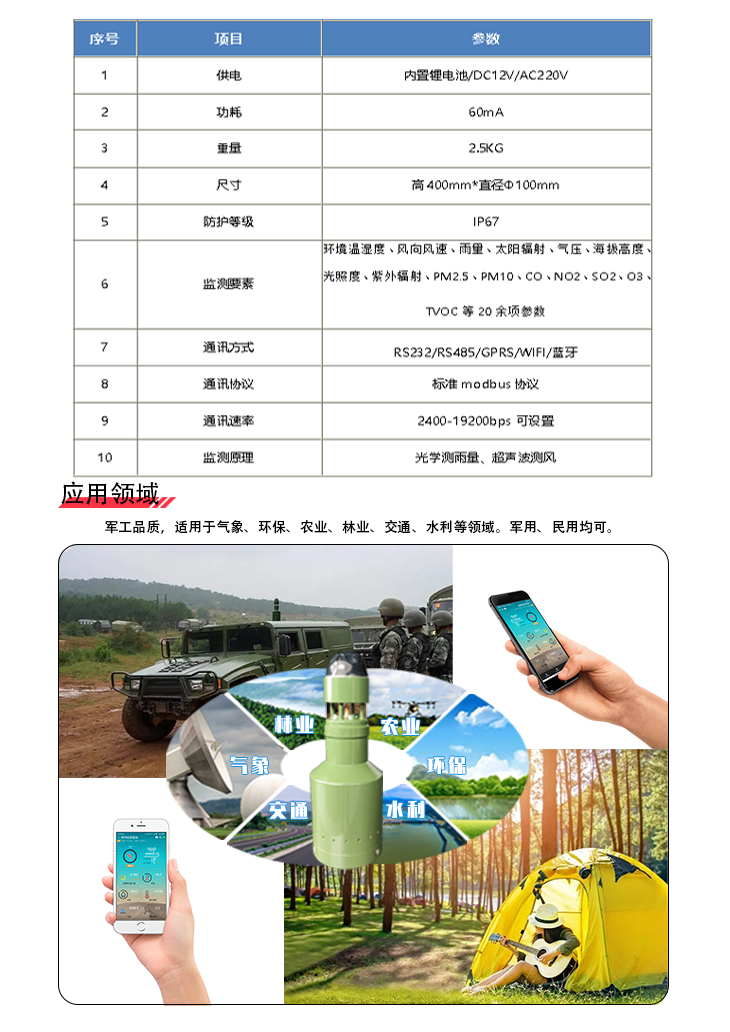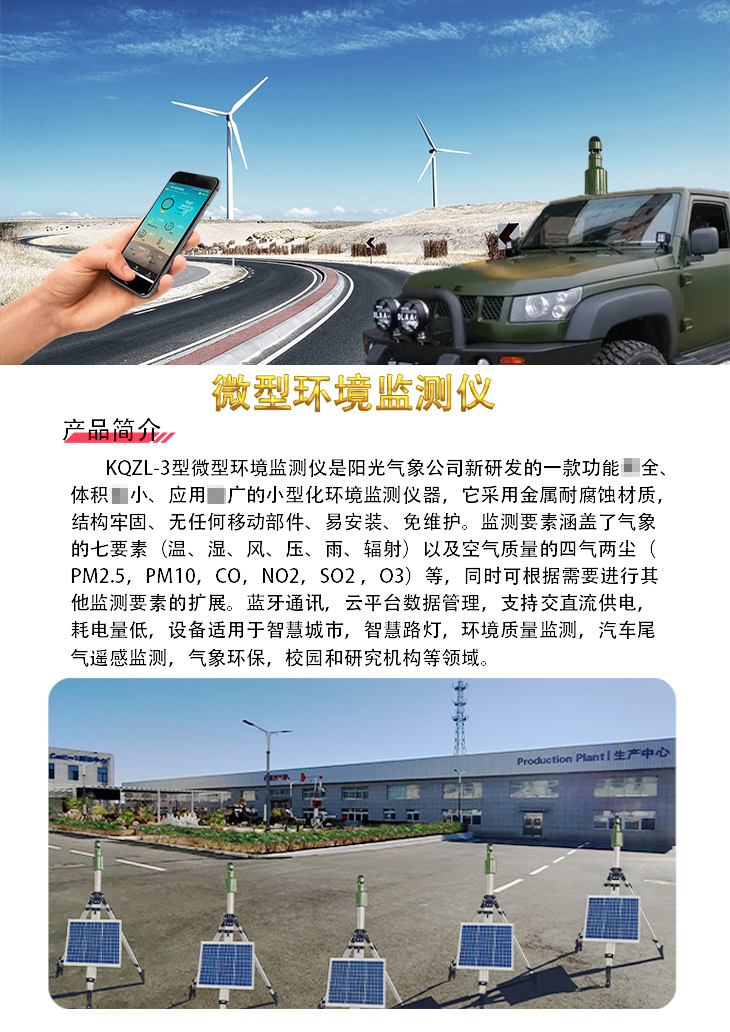 KQZL-3型微型環境監測儀是陽光氣象公司新研發的一款功能全、體積小、應用廣的小型化環境監測儀器,它采用金屬耐腐蝕材質,結構牢固、無任何移動部件、易安裝、免維護。監測要素涵蓋了氣象的七要素(溫、濕、風、壓、雨、輻射)以及空氣質量的四氣兩塵(PM2.5,PM10,CO,NO2,SO2 ,O3)等,同時可根據需要進行其他監測要素的擴展。藍牙通訊,云平臺數據管理,支持交直流供電,耗電量低,設備適用于智慧城市,智慧路燈,環境質量監測,汽車尾氣遙感監測,氣象環保,校園和研究機構等領域。