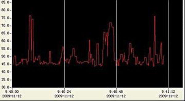 智能噪聲儀,采用數(shù)字化聲學(xué)分析測(cè)試儀為基礎(chǔ)進(jìn)行連續(xù)測(cè)量(一般持續(xù)測(cè)量24小時(shí)),每間隔1.0s自動(dòng)采樣記錄,并使用計(jì)算機(jī)讀取數(shù)據(jù),繪制噪聲曲線(dB-h)。為了解城市輕軌鐵路噪聲對(duì)某小區(qū)影響的情況,,于2009年11月12日對(duì)某小區(qū)輕軌噪聲進(jìn)行了12小時(shí)連續(xù)監(jiān)測(cè),測(cè)點(diǎn)距輕軌直線距離70米。監(jiān)測(cè)統(tǒng)計(jì)結(jié)果如下