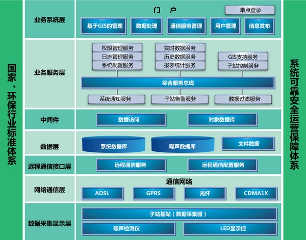 噪聲監管系統的目標是將噪聲污染源的狀態利用傳感技術、通訊技術、計算機及其網絡技術、GIS技術、信息業務處理系統有機結合而構成的新型環境噪聲監測和管理系統。系統將以GIS技術和信息業務處理系統為核心,利用在線監測終端設備(通訊方式可選擇ADSL/LAN/CDMA/GPRS/3g),把相關噪聲數據傳送到服務器。服務器端可由基于ORACLE的數據庫和基于.NET架構開發的服務端軟件組成。采用C/S與b/s結合多客戶分布式的城市噪聲監管信息化系統方式,實現對噪聲跟蹤監測,并根據遠程返回的數據,安排執法工作人員對出現的噪聲參數超標等不正常情況及時做出相應的處理,并根據噪聲的歷史數據,為管理部門決策提供相關支持。