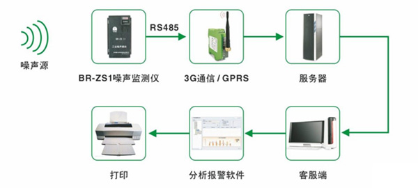 現場噪聲數據采集裝置及LED顯示屏實時將現場噪聲數據采集到智能監控終端,數據通過網絡傳輸到監控中心,完成統一管理、數據存儲、并實時顯示在室外的LED屏上,通過ZS3型噪聲自動監測系統將噪聲分貝數據,噪聲聲頻數據,設備數據等發到監控調度中心調度中心實現對噪聲數據的接收、存儲、顯示、報表打印輸出等信息管理,并支持實時數據與歷史數據讀取。