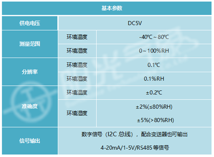4、數字信號輸出,I2C總線與微控制器進行通信,能輸出數字式溫濕度數據。