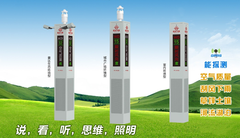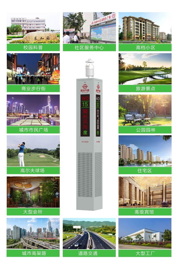 PC-9XQH 景區氣象站以“物聯網+智慧感知”為核心,建立覆蓋全區域的環境空氣質量自動監測網絡,并實時顯示播報。景區氣象站由金屬外殼立柱、氣象環境傳感器、系統采集主機、LED顯示、智能語音播報、物聯網云平臺數據存儲、終端顯示組成。