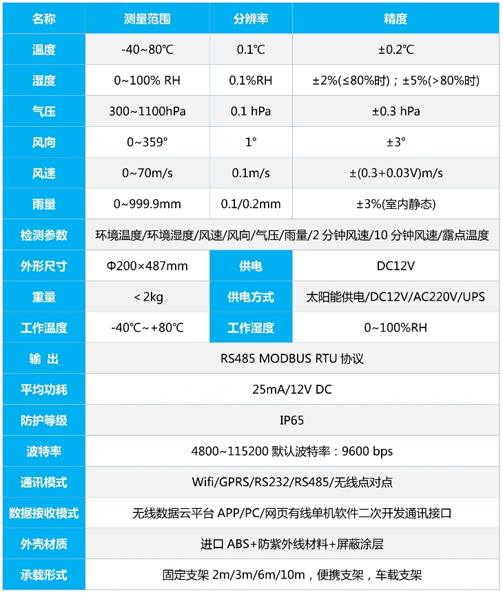 PC-8K型氣象六參數環境監測儀是我公司自主研制的一款測量多種氣象要素的一體化氣象站,可同時測量大氣溫度、大氣濕度、風速、風向、氣壓、雨量等主要氣象要素。其中雨量為高精度翻斗式雨量傳感器,其特點是精度高,響應速度快,串口輸出,方便用戶直接通過PC或外接儀器進行采集。
