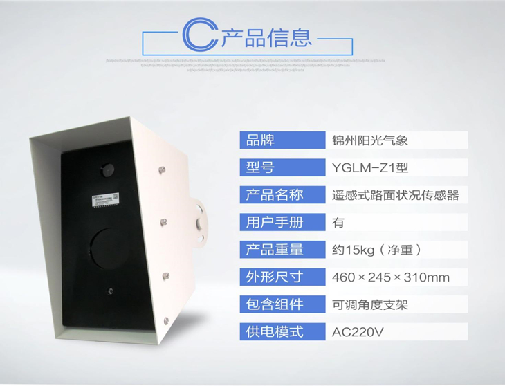 YGLM-Z1型遙感式路面狀況傳感器被安裝在一個全天候、耐久的外殼中,以保證承受惡劣天氣,這使得它在任何天氣條件下能提供精準數據。通過提供路面條件信息,YGLM-Z1型遙感式路面狀況傳感器為道路管理部門提供準確的監測數據,在道路安全出現險情之前,采取相應措施。