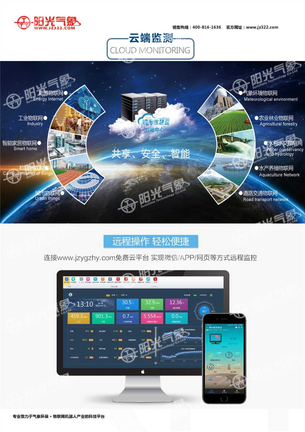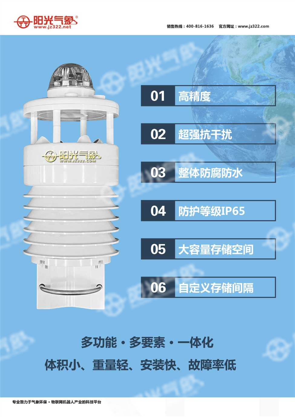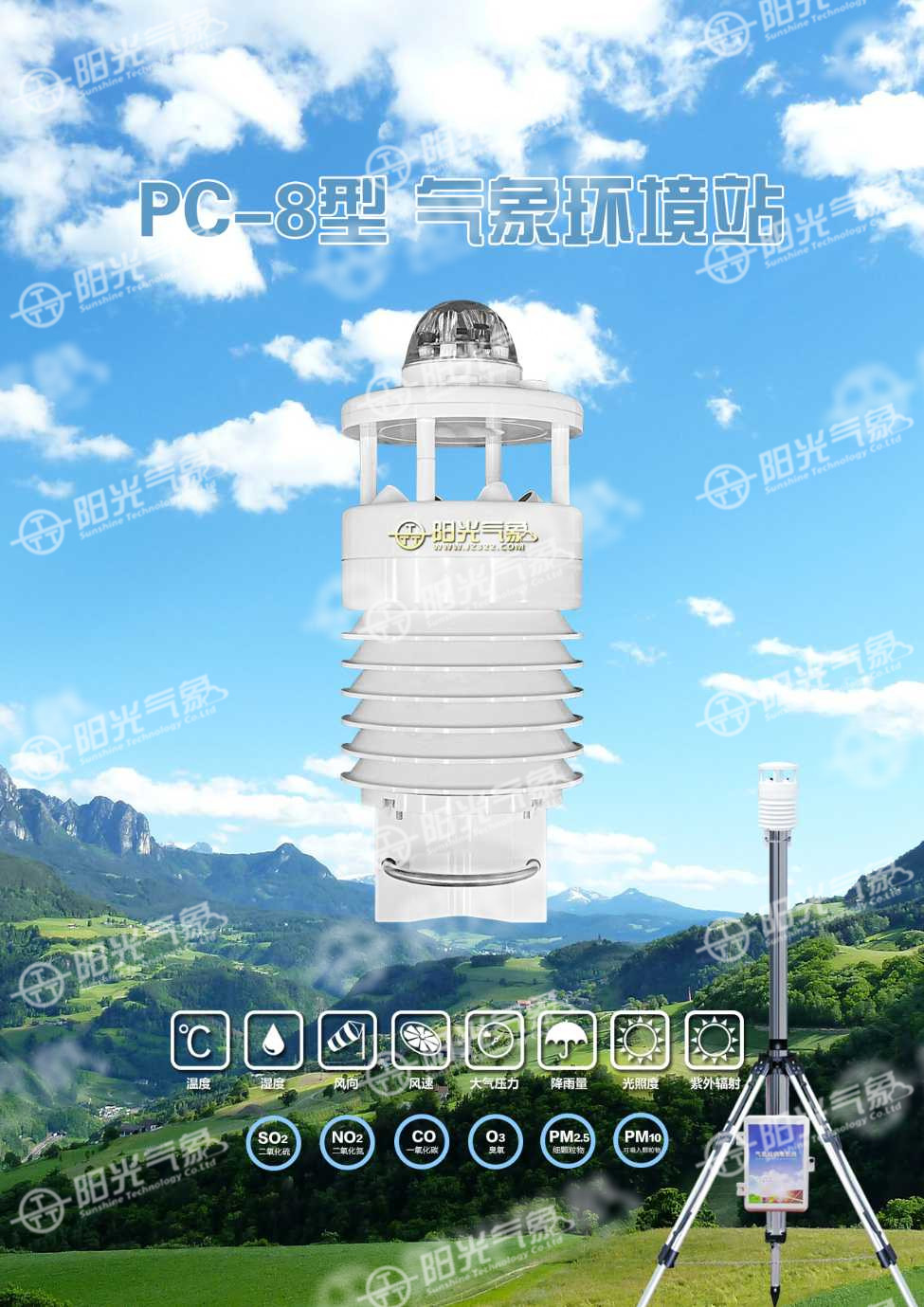 PC-8型一體化氣象站,其采用超聲波測風技術、光學測雨技術、光輻射測試技術及其它傳感技術并巧妙結合為一體的新型結構技術。又將數據采集、數據網絡通訊等功能合為一體的傳感設備。這種具有綜合氣象環境探測功能的環境站,稱為 PC-8型氣象環境站。
