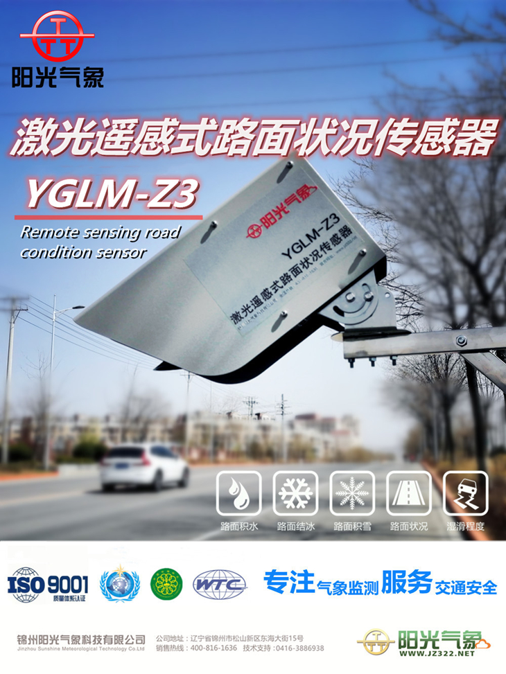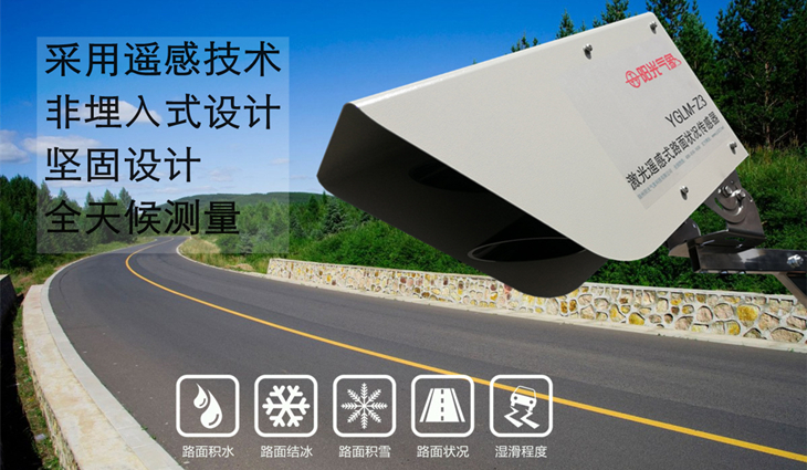 YGLM-Z3型激光遙感式路面狀況傳感器采用多光譜測量技術,傳感器不需要植入路面內即可準確地檢測出道路表面結冰、積雪、水膜的厚度及濕滑程度,監測儀集成了微型處理器來識別道路或機場跑道的路面狀態。