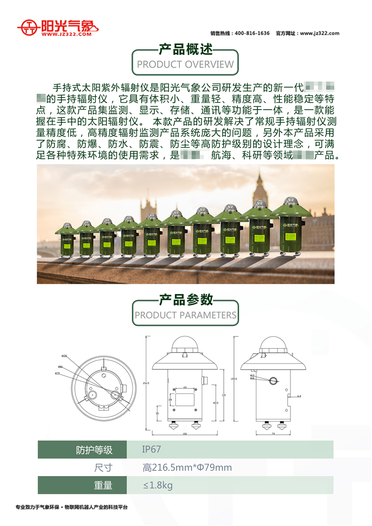 TBQ-ZW-SC手持式紫外輻射儀是陽光氣象開發生產的新一代手持輻射儀。它具有體積小、重量輕、精度高、穩定性強等特點。這款產品集監測、顯示、存儲、通訊等功能于一體,解決了常規手持輻射儀精度低,高精度輻射監測產品系統龐大的問題。