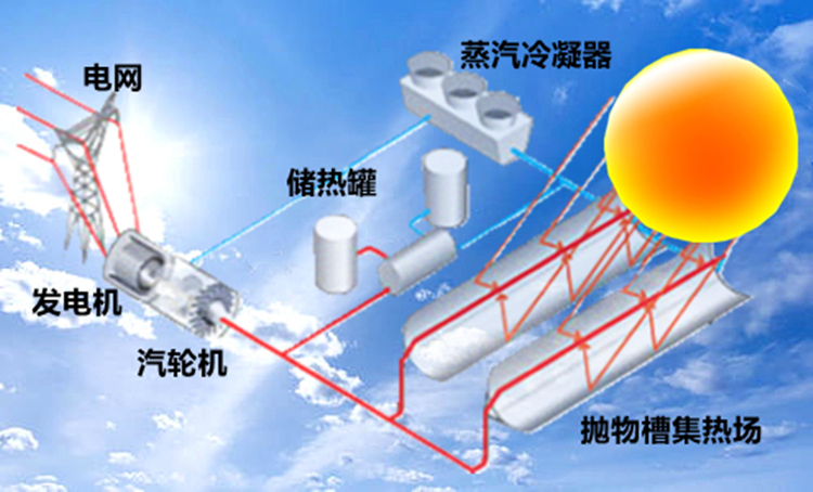 槽式太陽能熱發(fā)電是利用槽式聚光鏡將太陽光聚在一條線上,在這條線上安裝著一個管狀集熱器,用來吸收太陽能,并對傳熱工質進行加熱,再借助溫差發(fā)電機發(fā)電。槽式聚光器的拋物面對太陽進行的是一維跟蹤,聚光比為10~100,溫度可以達到400℃。