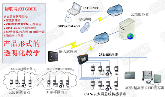 基于工程方案可以實現通用的物聯網網絡架構,在傳感層通過無線組網或現場總線組網實現對各種物理量的傳感采集和反饋控制,通過RFID讀寫器實現對人或物體的ID識別,通過視頻圖像采集設備實現環境圖像數據獲取,數據通過網關轉換為標準的網絡數據流匯聚到云端服務器,在服務器端實現數據的智慧處理,再由服務器通過Internet或3G網絡實現廣域的數據發布,與各種終端,包括手機實現智能的交互與管理。