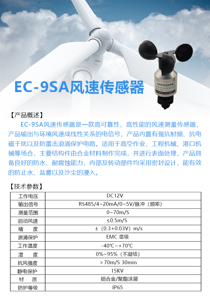 EC-9SA風速傳感器是一款高可靠性、高性能的風速測量傳感器,產品輸出與環境風速成線性關系的電信號,產品內置有強抗射頻、抗電磁干擾以及防雷擊浪涌保護電路。適用于高空作業,工程機械,港口機械等場合,主要結構件由合金材料制作完成,并進行表面處理,產品具備良好的防水、耐腐蝕能力,內部及轉動部件均采用密封設計,能有效的防止水、鹽霧以及沙塵的浸入。