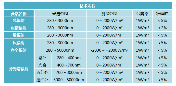 太陽輻射是氣象觀測指標中重要內容,根據國際氣象組織WMO標準要求,太陽輻射標準觀測分為:總輻射、散射輻射、直接輻射、反射輻射、凈全輻射,太陽光譜輻射(紫外光、可見光,近紅外光,遠紅外光)