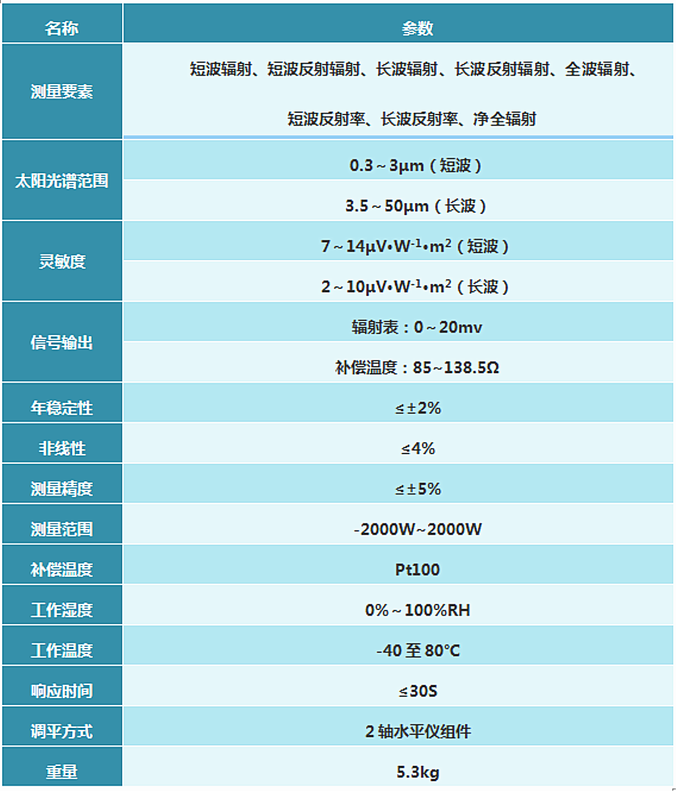 每只輻射表都分別有各自的靈敏度系數和輸出導線,可單獨輸出各個數據,同時通過各自的輸出數據進行組合,分別能測量短波輻射、短波反射輻射、長波輻射、長波反射輻射、全波輻射、凈全輻射、短波反射率和長波反射率。