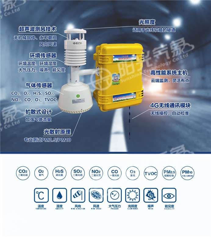 1、 隧道環(huán)境監(jiān)測(cè):氣象五參數(shù)(風(fēng)速風(fēng)向、溫濕度、大氣壓力);AQI七參數(shù)(PM2.5、PM10、NO2、CO、SO2、O3、TVOC),光照度、噪聲、CO2、O2、H2S、隧道能見(jiàn)度VI等;