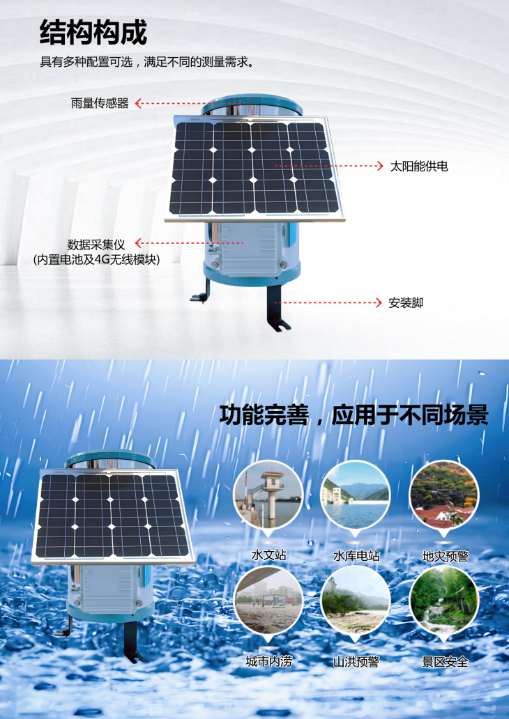 PC-2Y1型一體式自動雨量站是用于測量雨量水文信息的自動觀測儀器。自動雨量站由數據采集儀、雨量傳感器、無線通訊模塊、太陽能供電系統、云平臺軟件等部分構成。數據采集儀用于采集及記錄雨量信息,并通過4G無線模塊向云平臺上報數據,系統采用一體式設計,安裝方便。
